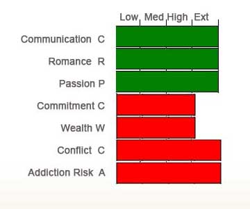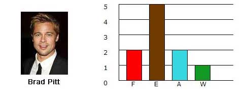 Here we find that Brad Pitt, who has much more Earth than Angelina Jolie (who has none!) provided her with stability and longterm security. Angelina Jolie has more Fire and gave him the push he needed to get married as well as to go around the world to satisfy her need for emotional security (more Water) and mothering instincts (Venus in Cancer) by adopting and having children. Interestingly, the conflict that shows in the graph below is offset by their acting as they even tried their best to bomb and kill each other in Mr. and Mrs. Jones!